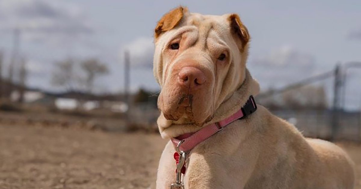 This Shar-Pei dog named Tweedy was abandoned by someone near the train tracks in