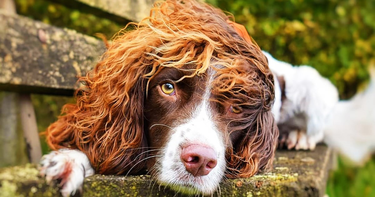 The beautiful chestnut curly hair of a Springer Spaniel named Finley can not help