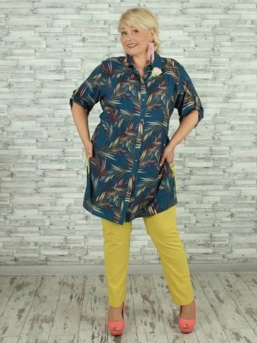 Mescola i pantaloni gialli con una camicia verde scuro a lunghezza ginocchio decorata con una stampa botanica per un look diverso. Scarpe corallo e orecchini abbinati offrono una vivace esplosione di colore.