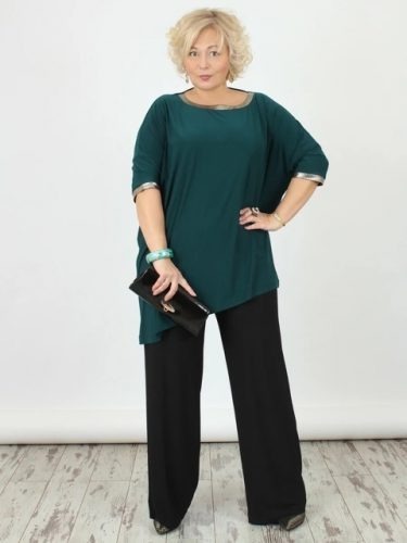 Per un’occasione più formale, opta per pantaloni neri a gamba ampia e una camicetta di seta in una tonalità blu-verde, con maniche drammatiche e un orlo asimmetrico, accentuato con rifiniture color oro. Una clutch elegante sostituisce la solita borsa.
