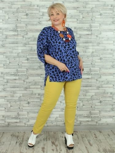 Un look chic ma semplice che sfida ogni aspettativa «da nonna». Abbina pantaloni dritti giallo tenue a una camicia blu con piccoli puntini neri, con maniche più corte e una parte posteriore estesa, completati da zeppe bianche per comfort e stile.