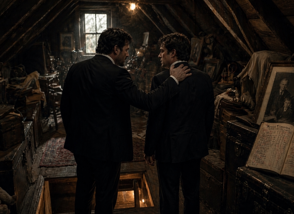 Träpanelerna i korridoren knakade under konfrontationens tyngd, ett ljud som nästan dränktes av de två männens tunga, hackiga andhämtning – som om de delat samma syre hela livet och ändå aldrig kunnat samsas om det.