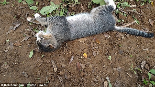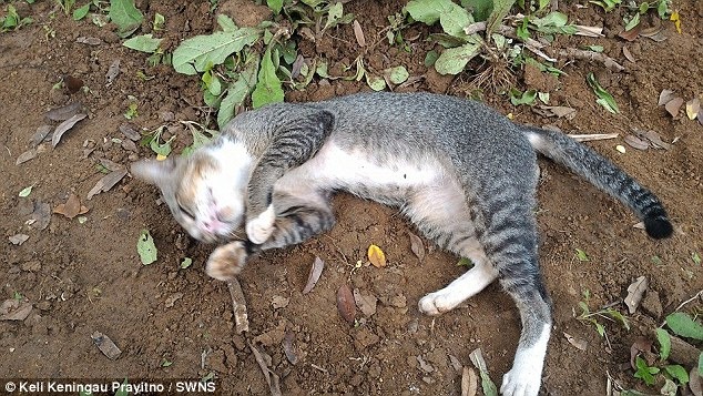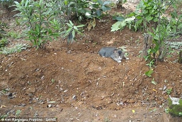 When Keli Keningau Prayitno, 28, strolled by the cat nestling a small blue headstone, she attempted to receive it, but it returned to the same spot.