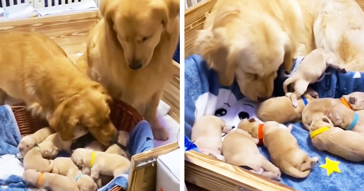 Such an incredible scene was caught by the owner of the golden retriever couple. This amazing duo was caring and taking a great attention to their newborn puppies.