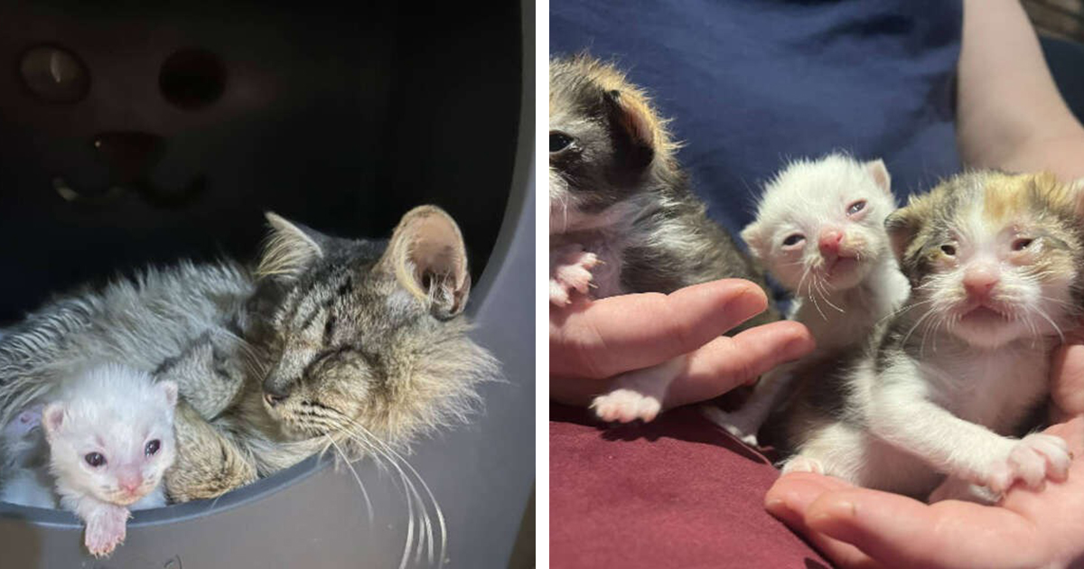 When a man visited his parents, he spotted a cat with crusted eyes. She was unable to open her eyes. He went after her and fuond 3 kittens in the den.