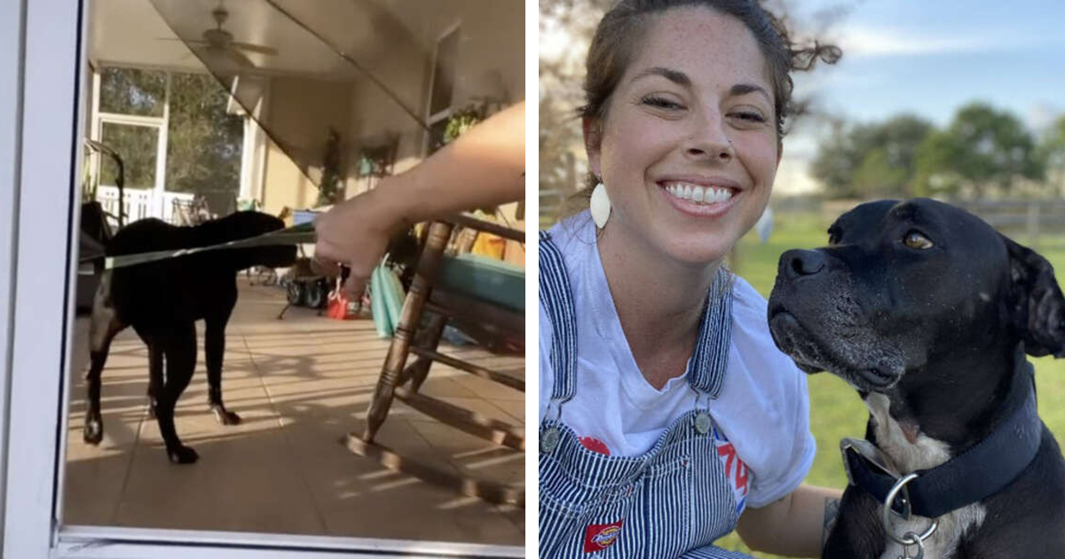 One day her mom went out on the porch of the farm and saw that the netting on the door was totally ripped off. She thought it was strange, then reailzed there was a dog sitting on the porch just walking around.