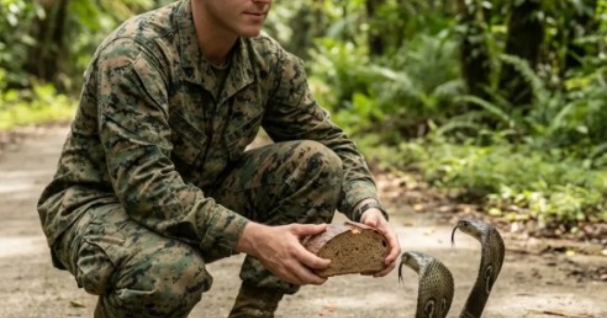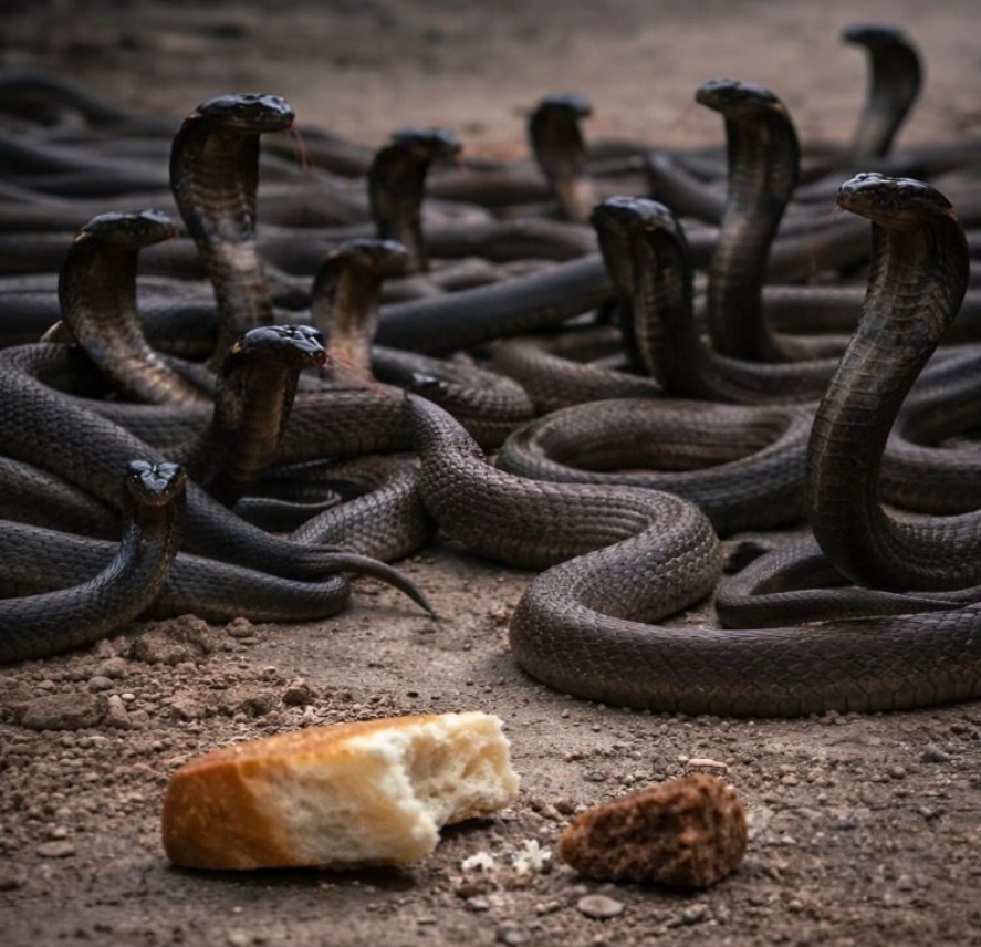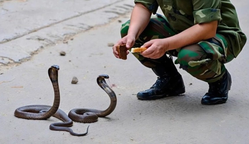 Col passare dei giorni, i serpenti crebbero rapidamente e il loro numero aumentò. Inizialmente erano solo due, ma ben presto decine di loro si radunavano intorno alla sua tenda durante l’ora del pasto. Il soldato comprese che la situazione stava sfuggendo al controllo e che, se i suoi comandanti avessero scoperto i suoi “animali domestici”, avrebbe ricevuto una severa punizione. Colto dalla paura, decise quella notte di liberarsi dei serpenti per sempre. Si preparò e, senza farsi vedere da nessuno, si allontanò dal campo verso una zona deserta dove poterli lasciare.