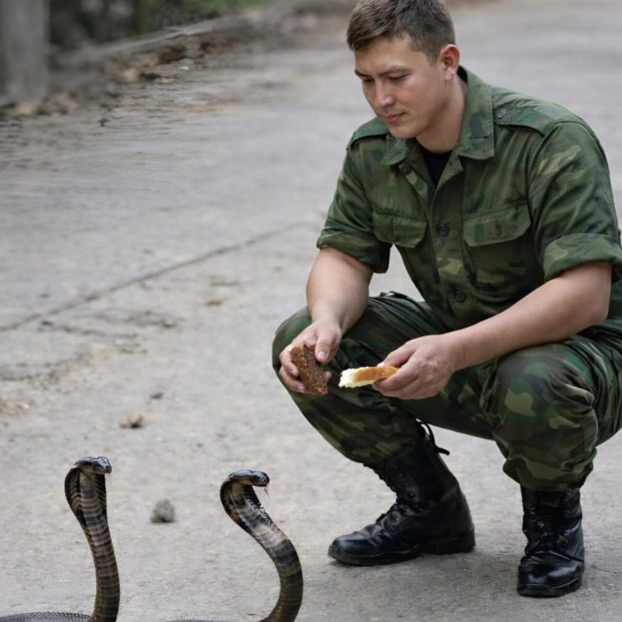 Il giovane soldato, mentre scavava una trincea ai margini del campo, notò due piccoli serpenti che si muovevano tra le pietre riscaldate dal sole. Le istruzioni militari imponevano l’eliminazione immediata di creature simili per garantire la sicurezza del personale. Tuttavia, il giovane non riuscì a fare del male a quei minuscoli esseri che lo guardavano con curiosità. Trasformò la loro presenza in un piccolo divertimento segreto, nutrendoli ogni giorno con pezzi di pane e carne. Quella pericolosa compagnia divenne, nei noiosi giorni di addestramento, il suo piccolo segreto e un gioco innocente.