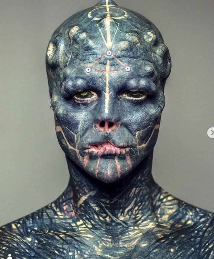 Il francese Anthony Loffredo, conosciuto in tutto il mondo come “The Black Alien”, è diventato una vera e propria sensazione globale grazie alle sue estreme modifiche corporee. Il suo obiettivo? Trasformarsi in un essere dall’aspetto alieno. Per riuscirci, ha affrontato procedure impressionanti e scioccanti: si è fatto amputare naso, orecchie e due dita, ha diviso la lingua in due e ha ricoperto l’intero corpo di tatuaggi neri. Le sue scelte radicali hanno attirato l’attenzione internazionale e acceso un acceso dibattito sui limiti della modificazione del corpo umano.