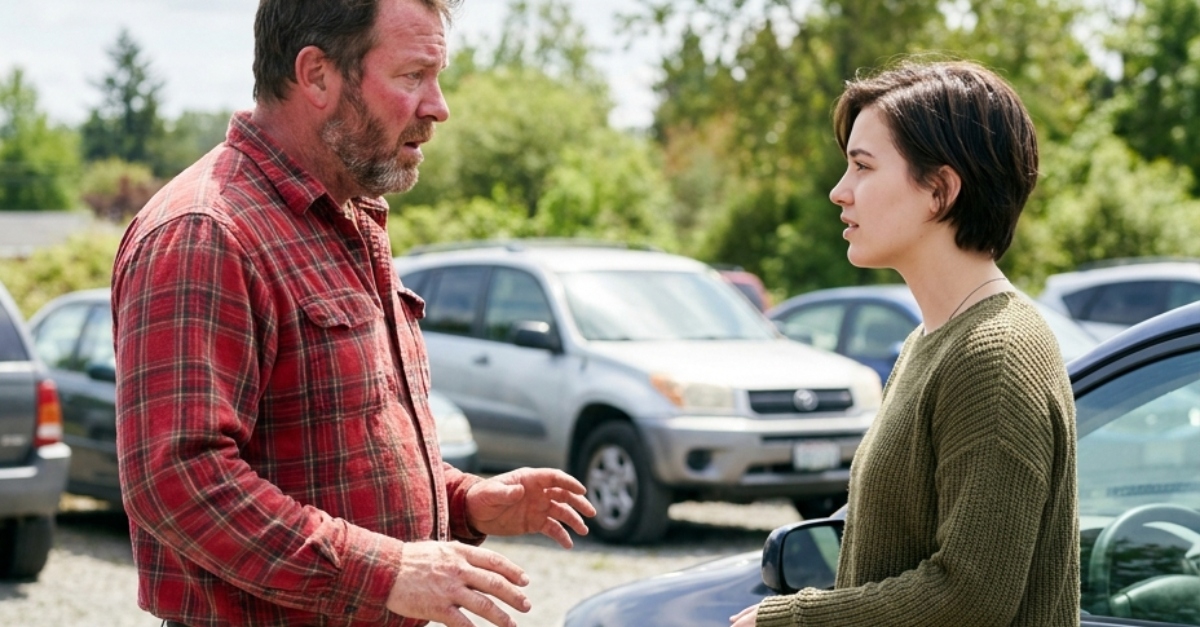 Il sole del pomeriggio si rifletteva sul cromo lucido del centro commerciale suburbano, ma l’atmosfera nella fila C era tutt’altro che luminosa. Un uomo stava in piedi sopra una berlina compatta, il volto arrossato da un calore cremisi che non aveva nulla a che vedere con il clima. Sferrò un calcio, il suo pesante stivale colpì lo pneumatico anteriore dell’auto con un tonfo sordo. «Sei praticamente sopra di me!» ruggì, gesticolando furiosamente verso lo spazio ristretto tra i loro veicoli. Sovrastava la scena, la sua ombra si allungava sulla portiera lato guida come una minaccia, pretendendo che lei spostasse il suo “rottame” prima che perdesse completamente la calma.