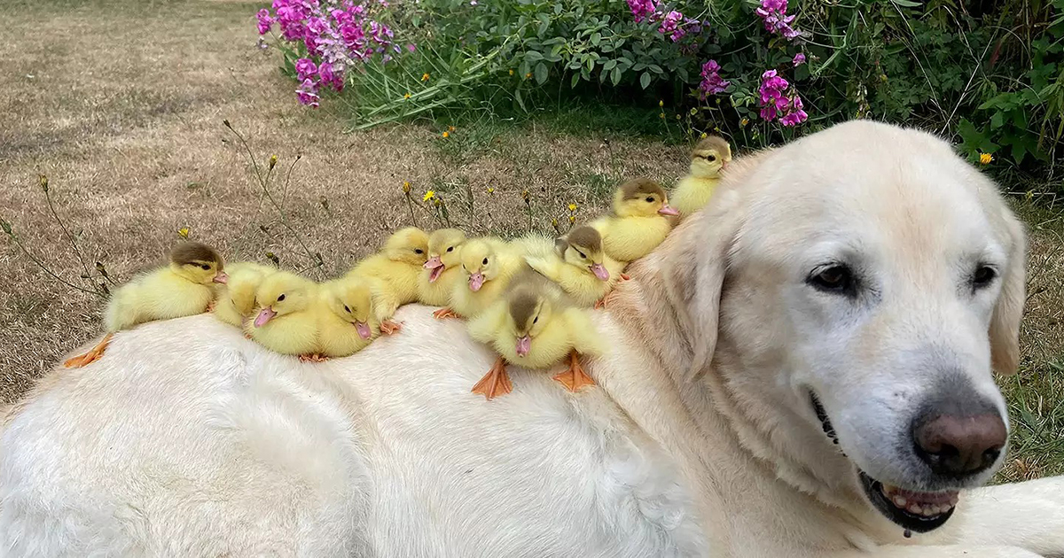 He is an expereinced duck parent. A couple of years ago, the dog, became a foster dad to 9 orphaned ducklings. And a year later, he took in one more bunch of orphaned ducklings.