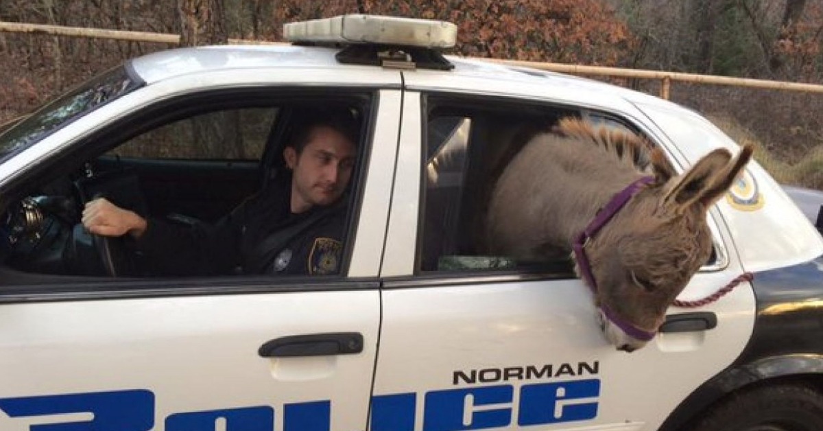 Soon the police officer Kyle Canaan arrived. At that time the lady managed to take the donkey to the side of road. The cop didn’t know how to deal with this awkward situation but then the woman suggested to bring him to her house. And as it would take so long to wait for a proper vehicle to transport him, the cop found the solution: he tranfered the donkey by his car. And this offer was gladly accepted by the animal.