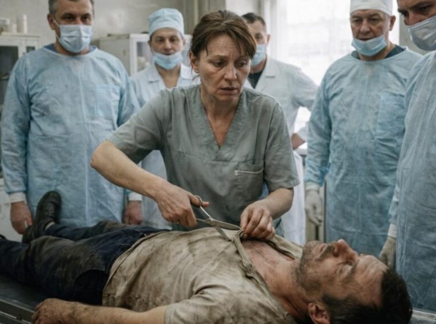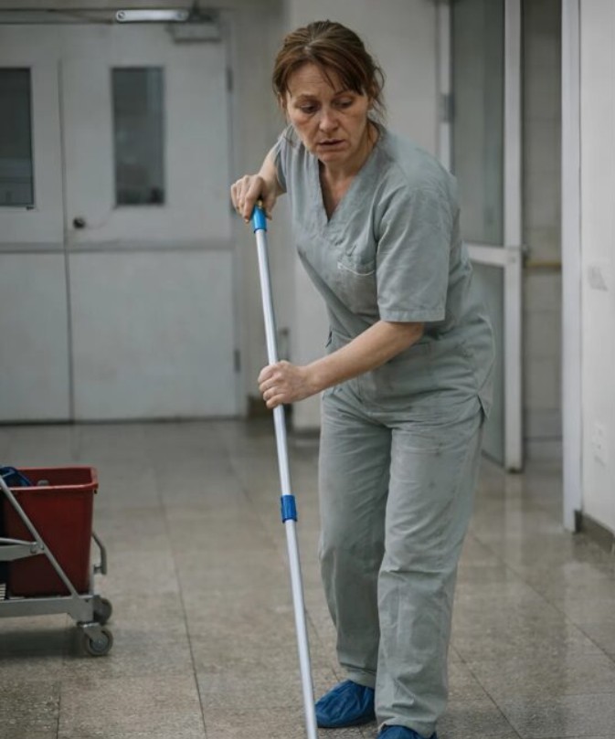 In quel momento, la donna delle pulizie Eva, con il mocio in mano, notò le vene gonfie sul collo dell’uomo e l’irregolarità del suo torace. Il corpo ebbe un ultimo sussulto, poi il respiro si fermò del tutto. Eva non esitò nemmeno un secondo: gettò il mocio di lato, afferrò un taglierino giallo dal tavolo, strappò la camicia sudicia dell’uomo e iniziò il massaggio cardiaco. Spingeva con tutta la forza che aveva, in modo ritmico, contando i secondi nella sua testa.