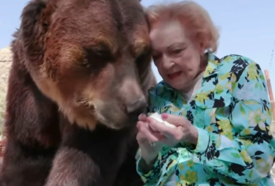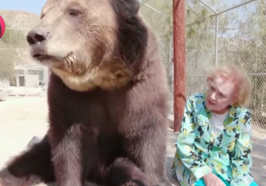 Il suo legame con gli animali è stato immortalato nel documentario del 2018 Betty White: First Lady of Television. In una scena memorabile, interagisce con un orso grizzly allo zoo di Los Angeles, accarezzandolo e persino baciandolo sulla fronte. L’orso risponde con affetto, prendendo snack dalle sue mani, dimostrando la capacità unica di Betty di connettersi con creature di ogni tipo e il suo carattere coraggioso e compassionevole.