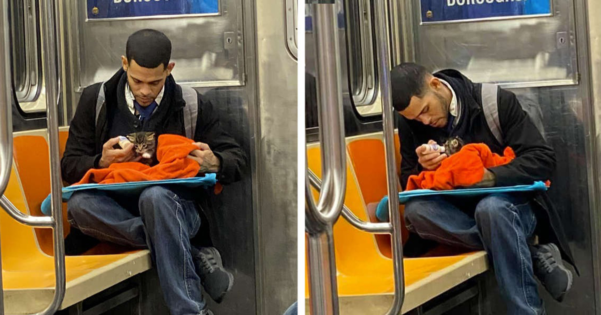 The kind woman named Gillian Roger was returning home on a subway when she spotted there a man with a little kitten on his hands. The loving scene lifted her spirit.