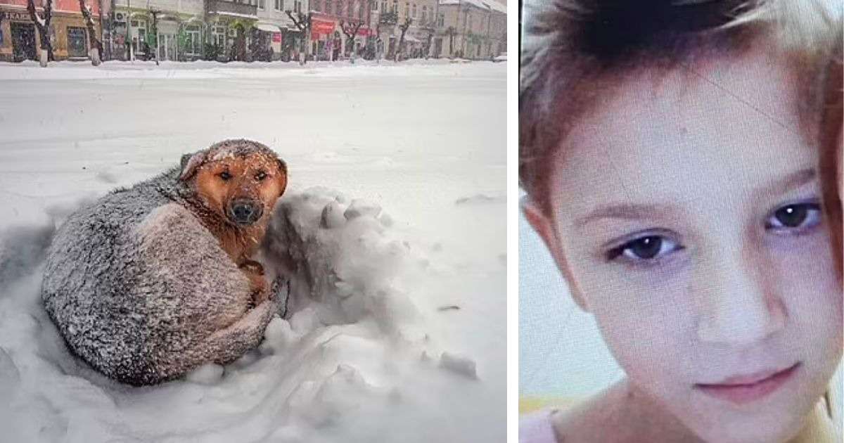 The little girl named Vika was lost in a huge snowstorm and stayed on the street with a stray dog cuddling her to warm and protect her.