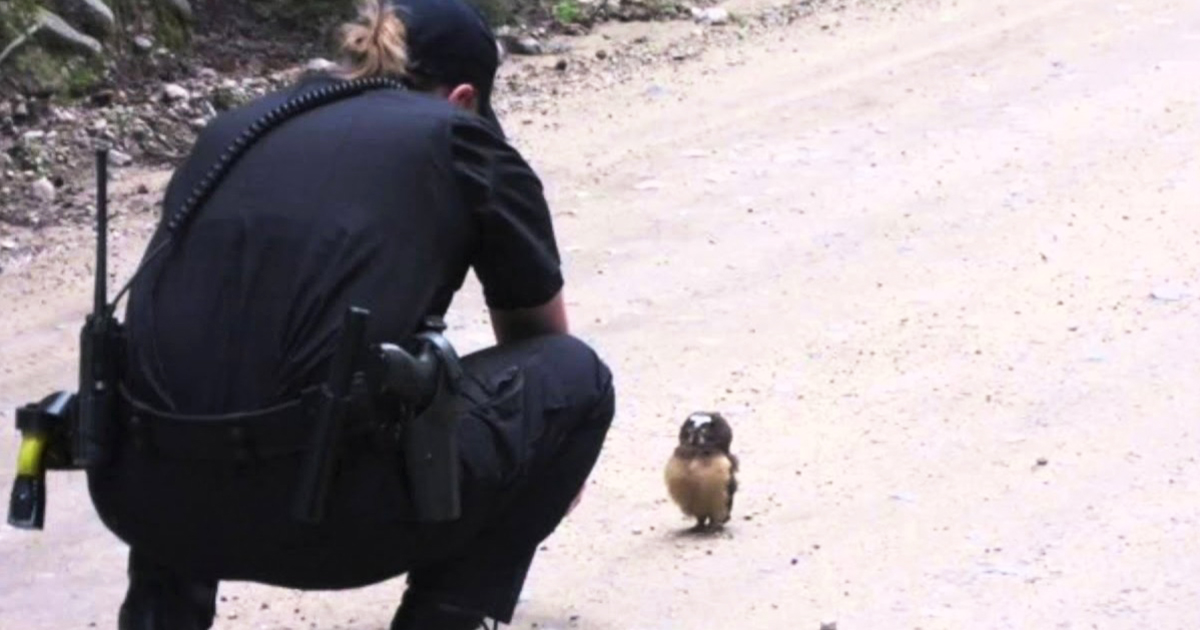 Such pleasant situation occurred with a police officer who came across a little owl on the street. She was driving on a mountain road when saw the tiny creature in the center of it. She stopped and approached the baby. Maybe the cutie had lost her way to forest.