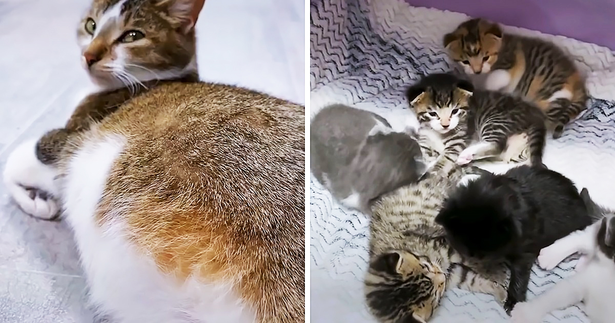 The pregnant rescue cat gave birth to 6 tiny kittens