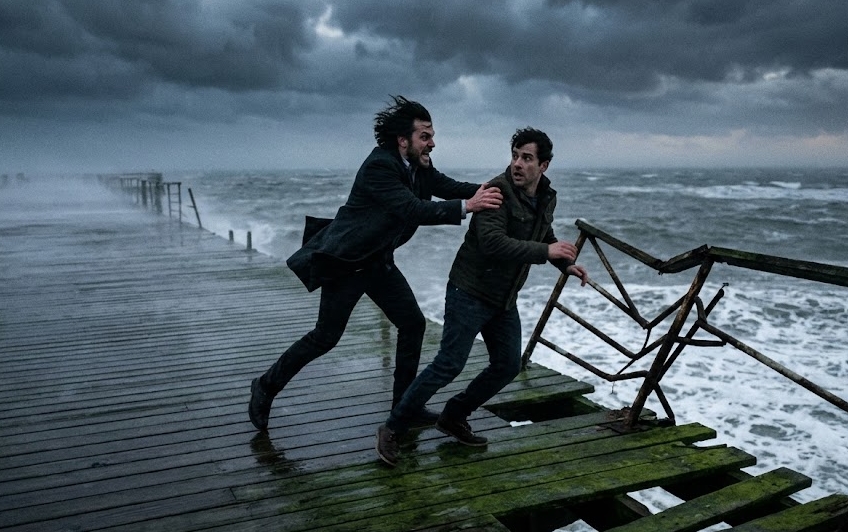 Julian cadde in ginocchio, il volto pallido contro il cielo sempre più scuro. Allungò un braccio, le dita a pochi centimetri dalla presa disperata di Elias. Ma mentre il rombo dell’onda in arrivo cresceva fino a diventare assordante, Julian si bloccò. Un attimo di esitazione si dilatò in un’eternità. In quell’istante sospeso, ricordò il tradimento che li aveva portati fin lì, lo sguardo di Elias mentre gli mentiva sui soldi, sulla vita e sulla donna che entrambi credevano di amare. La mano che avrebbe dovuto stringere il polso di Elias rimase sospesa, tremante. Non fu la malizia a trattenerlo in quell’ultimo momento, ma la schiacciante consapevolezza che forse alcune cose sono destinate a essere spazzate via dalla marea.