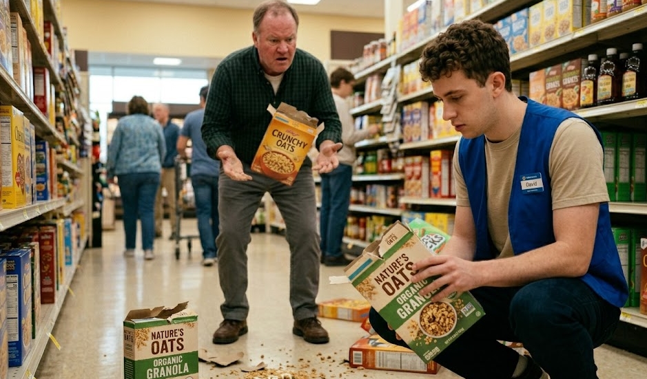 Il supermercato era immerso nel consueto brusio del tardo pomeriggio quando il rumore della plastica che urtava il pavimento in linoleum tagliò attraverso il sottofondo. Non era un errore né un inciampo accidentale; era il risultato deliberato di un uomo di fretta, i suoi movimenti bruschi e scattosi mentre afferrava una scatola di cereali dallo scaffale più alto. Nella sua fretta, ne spazzò via altre tre, facendole cadere a terra in un mucchio disordinato. Non si fermò a rimediare, ma passò accanto a un giovane dipendente che stava sistemando il corridoio vicino con tanta forza da costringerlo ad appoggiarsi allo scaffale per non perdere l’equilibrio.