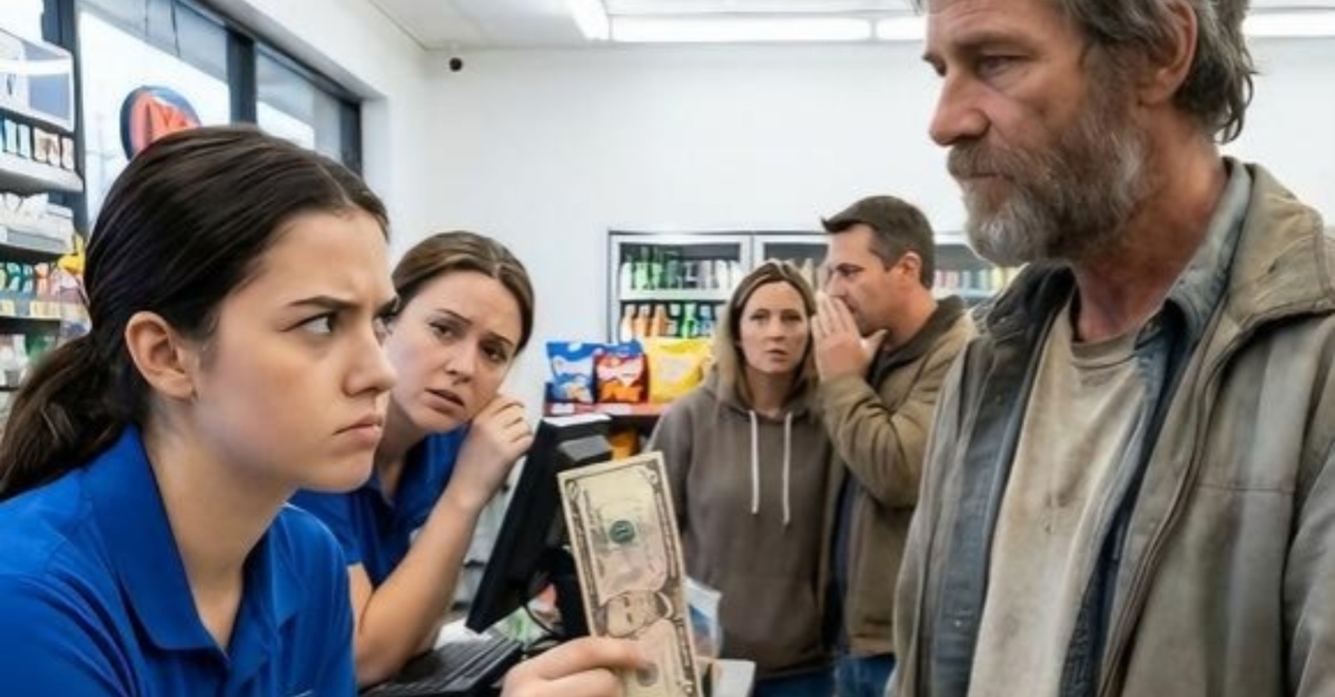 L’aria nel piccolo negozio di alimentari era densa dell’odore di caffè troppo tostato e dello stridio impaziente dei passi che si spostavano a terra. All’inizio della fila, un uomo con i vestiti coperti dalla polvere della strada teneva in mano una banconota da cinque dollari. Era stropicciata, macchiata e consumata ai bordi—proprio come lui. La cassiera, una donna la cui pazienza sembrava evaporata ore prima, non si limitò ad accettare il denaro; si ritrasse. Con un gesto teatrale, afferrò il bordo della banconota e la sollevò verso la luce al neon, come se fosse un reperto da esaminare. Il suo naso si arricciò in una smorfia di disgusto mentre guardava prima il denaro e poi il volto segnato dell’uomo.