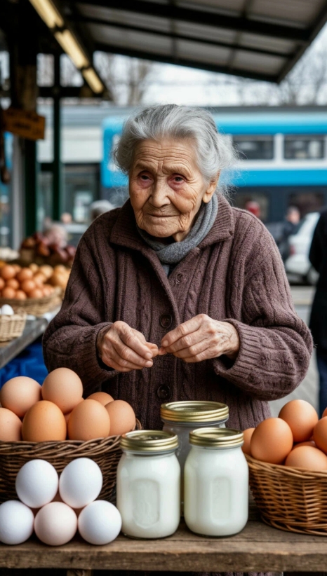 Tra i banchi colmi di verdure, patate e pane profumato, stava la nonna Maria. Ogni giorno portava con sé secchi pieni di uova di casa, sistemate con cura — bianche, marroni, ancora tiepide dalle sue mani.