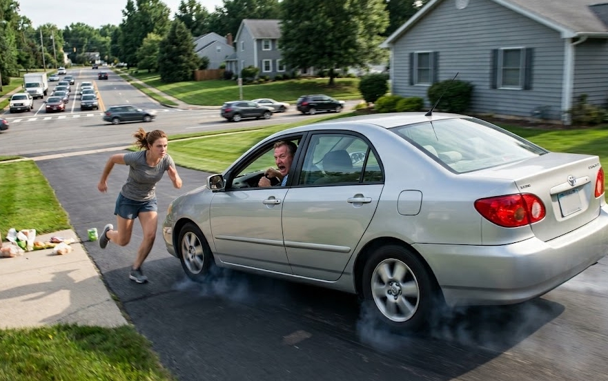 «Non si ferma!» gridò, la voce spezzata da una disperazione che riempiva l’abitacolo. Era un passeggero della propria paura, intrappolato in un ciclo in cui premeva sempre più forte il pedale sbagliato, convinto che il veicolo lo avesse semplicemente tradito. Fuori, la scena era un flusso indistinto di verde suburbano e grigio, finché una scia di movimento apparve nello specchietto laterale. Un vicino, un giovane che stava scaricando la spesa pochi secondi prima, stava ora correndo a tutta velocità. Non stava semplicemente correndo: stava inseguendo l’auto, con il volto teso in una concentrazione assoluta mentre guadagnava terreno sul lato del guidatore.