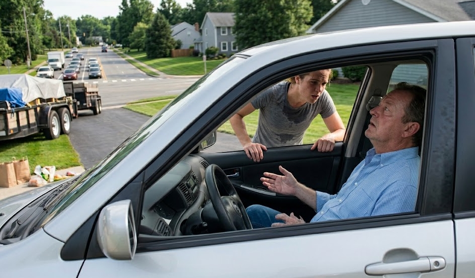 Per un lungo minuto, l’unico suono fu il crepitio del motore che si raffreddava e il respiro pesante e irregolare dei due uomini. Arthur era ricurvo contro il poggiatesta, le mani tremanti così forte da doverle nascondere sotto le cosce. Il vicino non si allontanò; restò con la mano sul telaio della portiera, appoggiando la fronte al vetro mentre riprendeva fiato. Il pericolo immediato era svanito, lasciando dietro di sé un profondo e instabile senso di sollievo. Alla fine, il giovane si fece indietro, si passò una mano sulla fronte sudata e accennò un cenno di stanchezza. Arthur riuscì finalmente a sollevare lo sguardo, la vista che si schiariva mentre prendeva coscienza della propria salvezza. Allungò una mano, offrendo un silenzioso gesto di gratitudine, consapevole che un semplice comando aveva appena evitato qualcosa di molto più grave di un incidente.