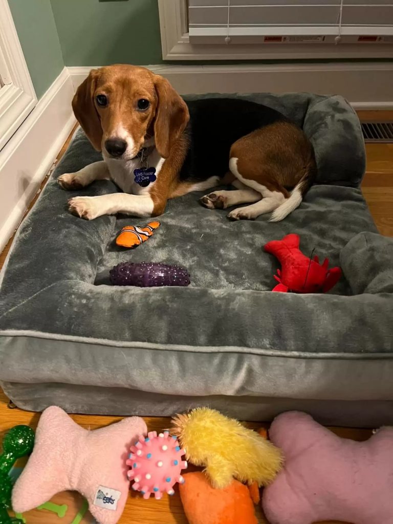 “The first day she was quite shy, but she claimed a dog bed in our family room. She wouldn’t leave the bed for more than a few feet” said Shrader, her owner.